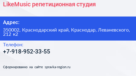 LikeMusic, репетиционная студия по адресу 350002, Краснодарский край, Краснодар, Леваневского, 212 к2 в дальнейшем Организация, размещена в следующих категориях:
