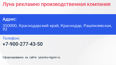 Луна, рекламно-производственная компания по адресу 350000, Краснодарский край, Краснодар, Рашпилевская, 92 в дальнейшем Организация, размещена в следующих категориях: