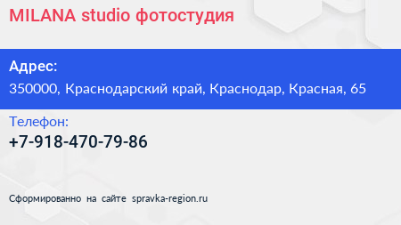 MILANA studio, фотостудия по адресу 350000, Краснодарский край, Краснодар, Красная, 65 в дальнейшем Организация, размещена в следующих категориях: