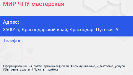 МИР ЧПУ, мастерская по адресу 350015, Краснодарский край, Краснодар, Путевая, 9 в дальнейшем Организация, размещена в следующих категориях: