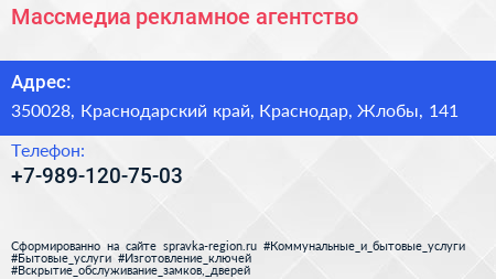 Массмедиа, рекламное агентство по адресу 350028, Краснодарский край, Краснодар, Жлобы, 141 в дальнейшем Организация, размещена в следующих категориях: