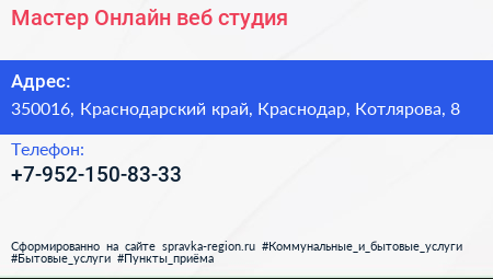 Мастер.Онлайн, веб-студия по адресу 350016, Краснодарский край, Краснодар, Котлярова, 8 в дальнейшем Организация, размещена в следующих категориях: