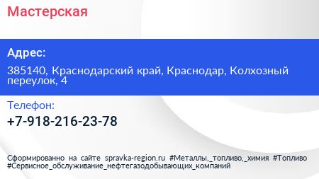 Мастерская по адресу 385140, Краснодарский край, Краснодар, Колхозный переулок, 4 в дальнейшем Организация, размещена в следующих категориях: