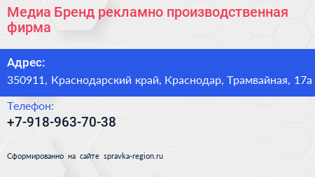 Медиа Бренд, рекламно-производственная фирма по адресу 350911, Краснодарский край, Краснодар, Трамвайная, 17а в дальнейшем Организация, размещена в следующих категориях: