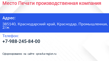 Место Печати, производственная компания по адресу 385140, Краснодарский край, Краснодар, Промышленная, 2/ж в дальнейшем Организация, размещена в следующих категориях: