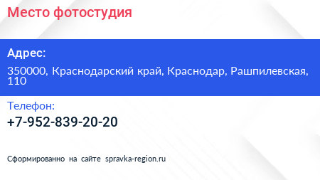 Место, фотостудия по адресу 350000, Краснодарский край, Краснодар, Рашпилевская, 110 в дальнейшем Организация, размещена в следующих категориях:
