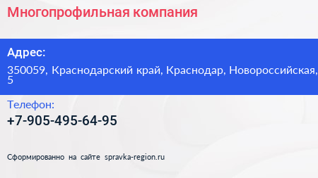 Многопрофильная компания по адресу 350059, Краснодарский край, Краснодар, Новороссийская, 5 в дальнейшем Организация, размещена в следующих категориях: