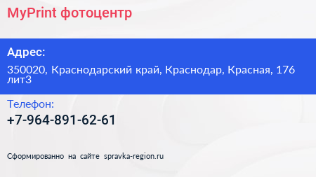 MyPrint, фотоцентр по адресу 350020, Краснодарский край, Краснодар, Красная, 176 лит3 в дальнейшем Организация, размещена в следующих категориях: