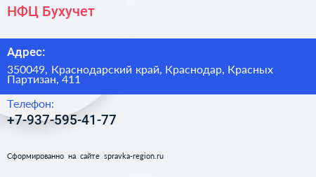 НФЦ Бухучет по адресу 350049, Краснодарский край, Краснодар, Красных Партизан, 411 в дальнейшем Организация, размещена в следующих категориях: