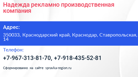 Надежда, рекламно-производственная компания по адресу 350033, Краснодарский край, Краснодар, Ставропольская, 14 в дальнейшем Организация, размещена в следующих категориях: