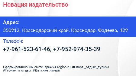Новация, издательство по адресу 350912, Краснодарский край, Краснодар, Фадеева, 429 в дальнейшем Организация, размещена в следующих категориях:
