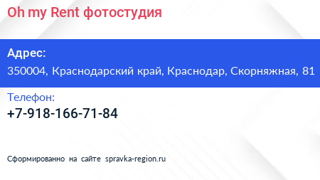 Oh, my Rent!, фотостудия по адресу 350004, Краснодарский край, Краснодар, Скорняжная, 81 в дальнейшем Организация, размещена в следующих категориях: