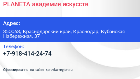 PLANETA, академия искусств по адресу 350063, Краснодарский край, Краснодар, Кубанская Набережная, 37 в дальнейшем Организация, размещена в следующих категориях: