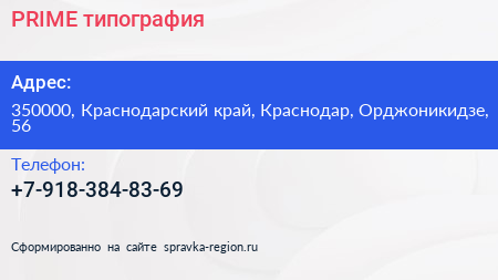 PRIME, типография по адресу 350000, Краснодарский край, Краснодар, Орджоникидзе, 56 в дальнейшем Организация, размещена в следующих категориях: