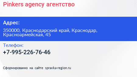 Pinkers agency, агентство по адресу 350000, Краснодарский край, Краснодар, Красноармейская, 45 в дальнейшем Организация, размещена в следующих категориях: