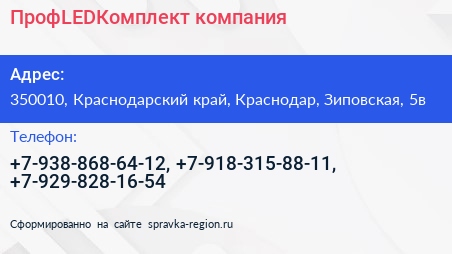 ПрофLEDКомплект, компания по адресу 350010, Краснодарский край, Краснодар, Зиповская, 5в в дальнейшем Организация, размещена в следующих категориях: