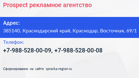 Prospect, рекламное агентство по адресу 385140, Краснодарский край, Краснодар, Восточная, 69/1 в дальнейшем Организация, размещена в следующих категориях: