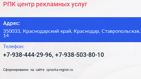 РПК, центр рекламных услуг по адресу 350033, Краснодарский край, Краснодар, Ставропольская, 14 в дальнейшем Организация, размещена в следующих категориях: