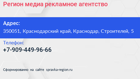 Регион медиа, рекламное агентство по адресу 350051, Краснодарский край, Краснодар, Строителей, 5 в дальнейшем Организация, размещена в следующих категориях: