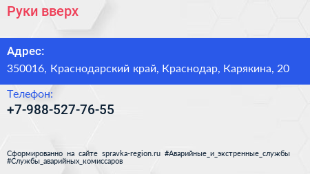Руки вверх по адресу 350016, Краснодарский край, Краснодар, Карякина, 20 в дальнейшем Организация, размещена в следующих категориях: