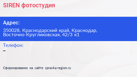 SIREN, фотостудия по адресу 350028, Краснодарский край, Краснодар, Восточно-Кругликовская, 42/3 к1 в дальнейшем Организация, размещена в следующих категориях: