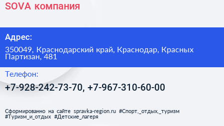 SOVA, компания по адресу 350049, Краснодарский край, Краснодар, Красных Партизан, 481 в дальнейшем Организация, размещена в следующих категориях: