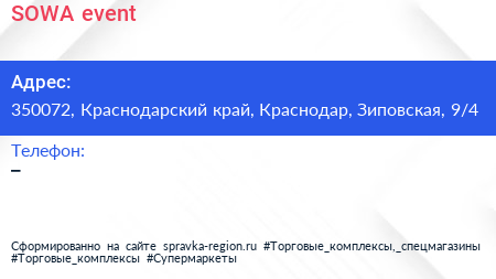 SOWA event по адресу 350072, Краснодарский край, Краснодар, Зиповская, 9/4 в дальнейшем Организация, размещена в следующих категориях: