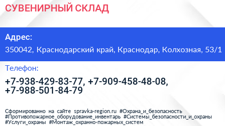 СУВЕНИРНЫЙ СКЛАД по адресу 350042, Краснодарский край, Краснодар, Колхозная, 53/1 в дальнейшем Организация, размещена в следующих категориях: