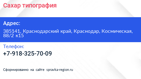 Сахар, типография по адресу 385141, Краснодарский край, Краснодар, Космическая, 88/2 к15 в дальнейшем Организация, размещена в следующих категориях: