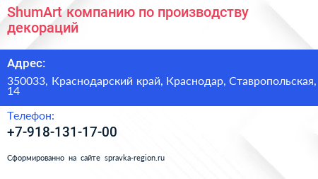 ShumArt, компанию по производству декораций по адресу 350033, Краснодарский край, Краснодар, Ставропольская, 14 в дальнейшем Организация, размещена в следующих категориях: