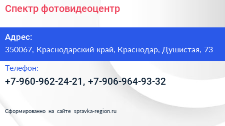 Спектр, фотовидеоцентр по адресу 350067, Краснодарский край, Краснодар, Душистая, 73 в дальнейшем Организация, размещена в следующих категориях: