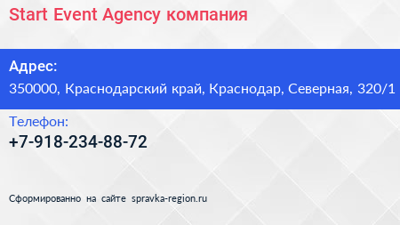 Start Event Agency, компания по адресу 350000, Краснодарский край, Краснодар, Северная, 320/1 в дальнейшем Организация, размещена в следующих категориях: