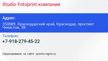 Studio Fotoprint, компания по адресу 350089, Краснодарский край, Краснодар, проспект Чекистов, 38 в дальнейшем Организация, размещена в следующих категориях: