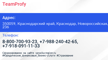 TeamProfy по адресу 350059, Краснодарский край, Краснодар, Новороссийская, 236 в дальнейшем Организация, размещена в следующих категориях: