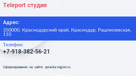 Teleport, студия по адресу 350000, Краснодарский край, Краснодар, Рашпилевская, 110 в дальнейшем Организация, размещена в следующих категориях: