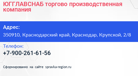 ЮГГЛАВСНАБ, торгово-производственная компания по адресу 350910, Краснодарский край, Краснодар, Крупской, 2/8 в дальнейшем Организация, размещена в следующих категориях: