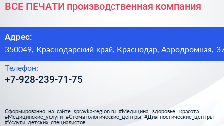 ВСЕ ПЕЧАТИ, производственная компания по адресу 350049, Краснодарский край, Краснодар, Аэродромная, 37 в дальнейшем Организация, размещена в следующих категориях: