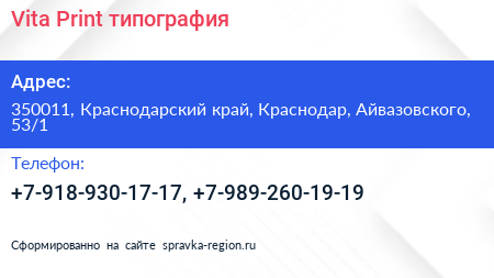 Vita Print, типография по адресу 350011, Краснодарский край, Краснодар, Айвазовского, 53/1 в дальнейшем Организация, размещена в следующих категориях: