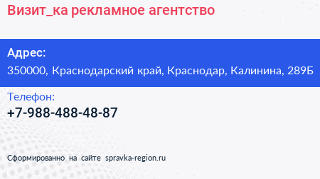 Визит_ка, рекламное агентство по адресу 350000, Краснодарский край, Краснодар, Калинина, 289Б в дальнейшем Организация, размещена в следующих категориях: