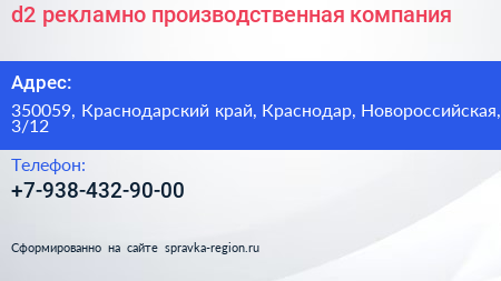 d2, рекламно-производственная компания по адресу 350059, Краснодарский край, Краснодар, Новороссийская, 3/12 в дальнейшем Организация, размещена в следующих категориях: