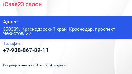 iCase23, салон по адресу 350089, Краснодарский край, Краснодар, проспект Чекистов, 22 в дальнейшем Организация, размещена в следующих категориях: