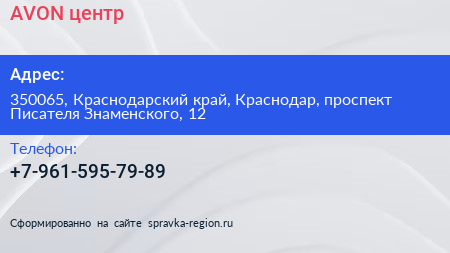 AVON, центр по адресу 350065, Краснодарский край, Краснодар, проспект Писателя Знаменского, 12 в дальнейшем Организация, размещена в следующих категориях: