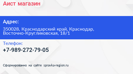 Аист, магазин по адресу 350028, Краснодарский край, Краснодар, Восточно-Кругликовская, 18/1 в дальнейшем Организация, размещена в следующих категориях: