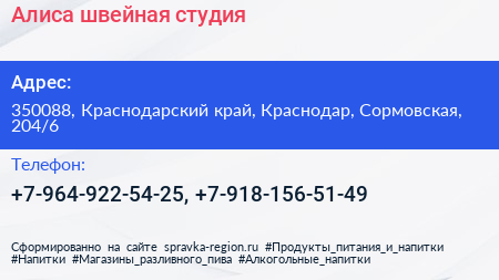 Алиса, швейная студия по адресу 350088, Краснодарский край, Краснодар, Сормовская, 204/6 в дальнейшем Организация, размещена в следующих категориях: