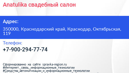 Anatulika, свадебный салон по адресу 350000, Краснодарский край, Краснодар, Октябрьская, 119 в дальнейшем Организация, размещена в следующих категориях: