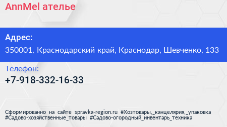 AnnMel, ателье по адресу 350001, Краснодарский край, Краснодар, Шевченко, 133 в дальнейшем Организация, размещена в следующих категориях: