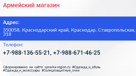 Армейский магазин по адресу 350058, Краснодарский край, Краснодар, Ставропольская, 318 в дальнейшем Организация, размещена в следующих категориях: