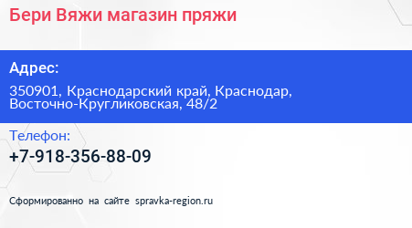 Бери Вяжи, магазин пряжи по адресу 350901, Краснодарский край, Краснодар, Восточно-Кругликовская, 48/2 в дальнейшем Организация, размещена в следующих категориях: