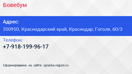 Бовебум по адресу 350910, Краснодарский край, Краснодар, Гоголя, 60/3 в дальнейшем Организация, размещена в следующих категориях: