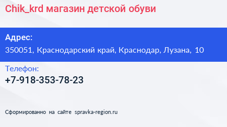 Chik_krd, магазин детской обуви по адресу 350051, Краснодарский край, Краснодар, Лузана, 10 в дальнейшем Организация, размещена в следующих категориях:
